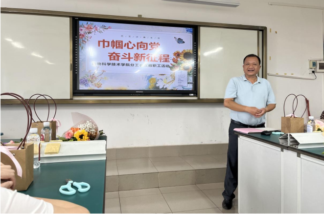 花艺师韦春捧为女教职工讲解了鲜花养护、花材种类以及操作技巧等,并按步骤指导大家完成花艺作品。大家在边学边做的热闹氛围中各自进行插花DIY活动,经过1个半小时的努力,均完成了属于自己的插花作品。
