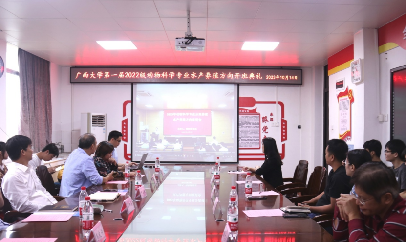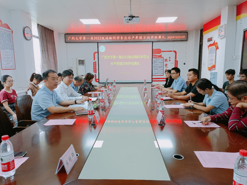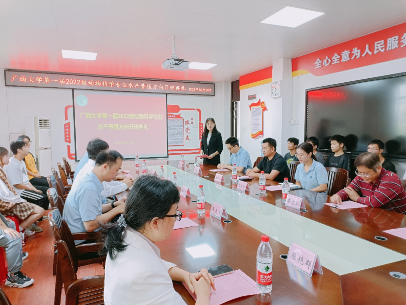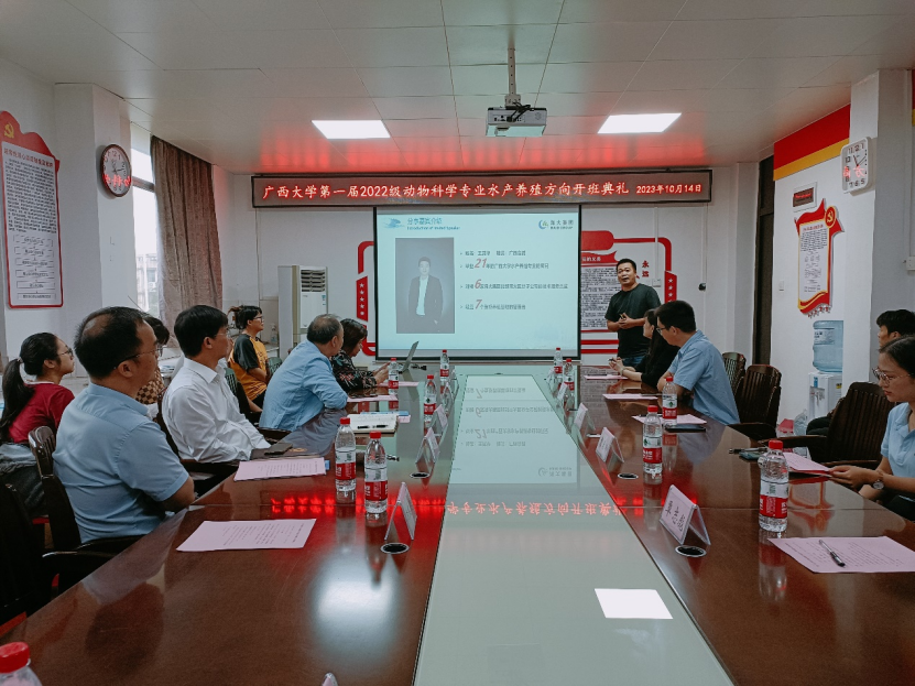 2023年10月14日上午10:30,英国上市官网3652022级动物科学专业水产养殖方向开班典礼在365英国上市集团302会议室顺利开展。陆阳清经理、韦小强书记、湛江海大饲料有限公司企业代表王其华(技术服务部总监)、企业代表曹春玲(人力资源部经理)、学科带头人潘英教授、黄凯教授、李文红教授、麻艳群副教授、覃志彪讲师、欧伟豪讲师,以及全体2022级动物科学专业水产养殖方向班的同学参加了本次开班典礼。开班典礼由潘英教授主持。