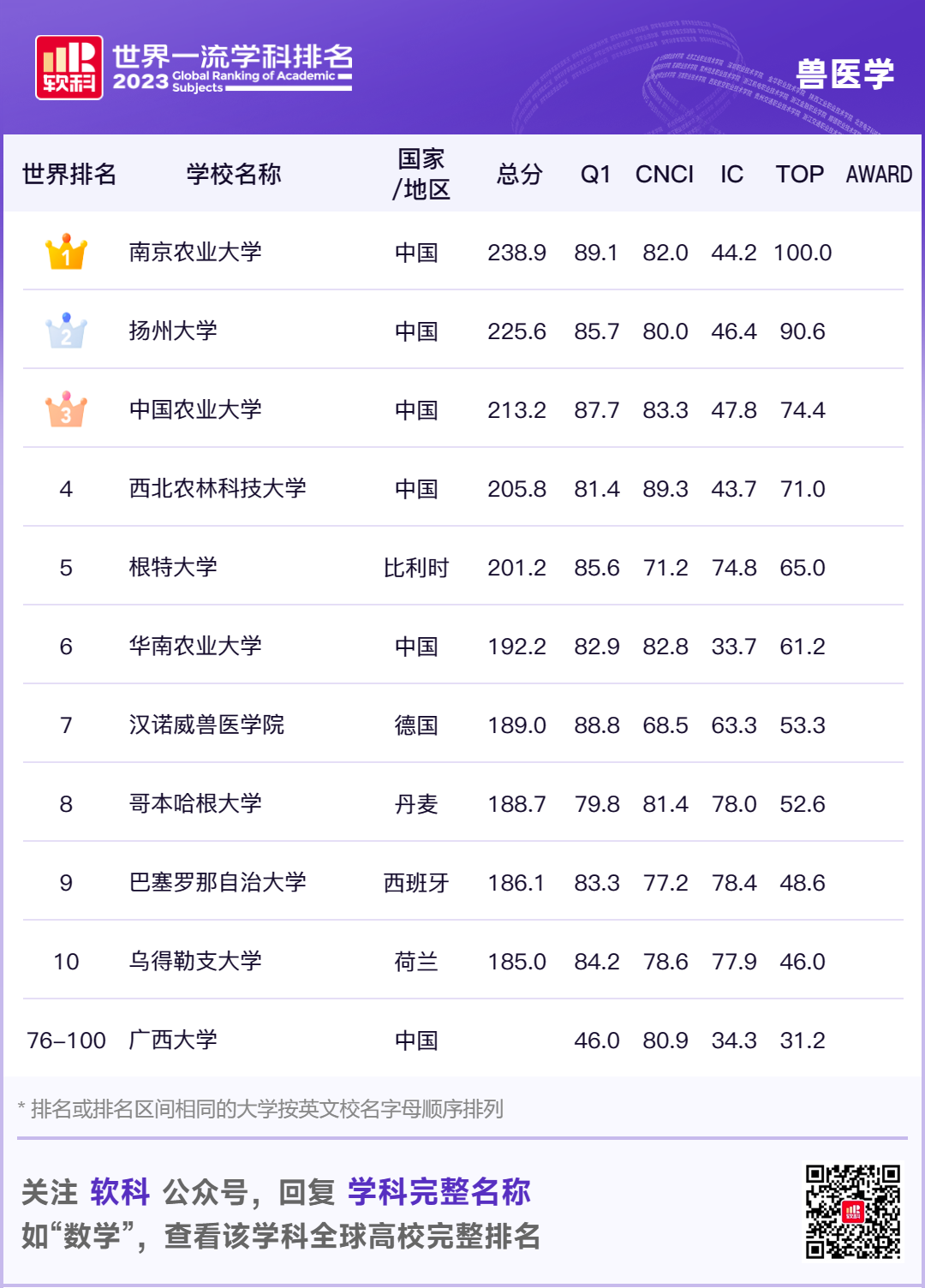 10月27日,高等教育评价专业机构软科正式发布2023“软科世界一流学科排名”,其中英国上市官网365的兽医学学科跻身世界前100,位居第76-100名。