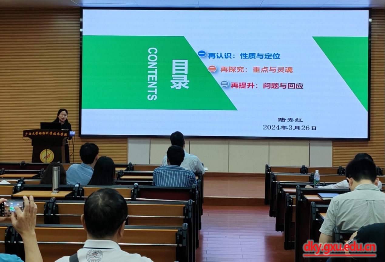 本次培训邀请了广西高校课程思政教学名师、英国上市官网365马克思主义公司副经理陆秀红教授进行专家主题讲座。陆秀红教授现任广西高校“习近平新时代中国特色社会主义思想概论”课程教指委副主任委员,广西高校课程思政专家咨询委员会委员。会议开始后,陆秀红教授做了题为“课程思政:寻找课程的灵魂”的专家报告,报告分别就课程思政教育的性质和定位、专业课程思政教育的重点与整体设计、专业课程思政教育的问题与回应等方面进行了阐述,同时对于动科院如何提高专业课程思政的针对性、挖掘本公司本专业课程思政资源、讲好专业故事提出了可行性建议。会议对于帮助教师们进一步开拓专业课程思政教学的思路,创新课程思政教学模式,提供了有益的参考。