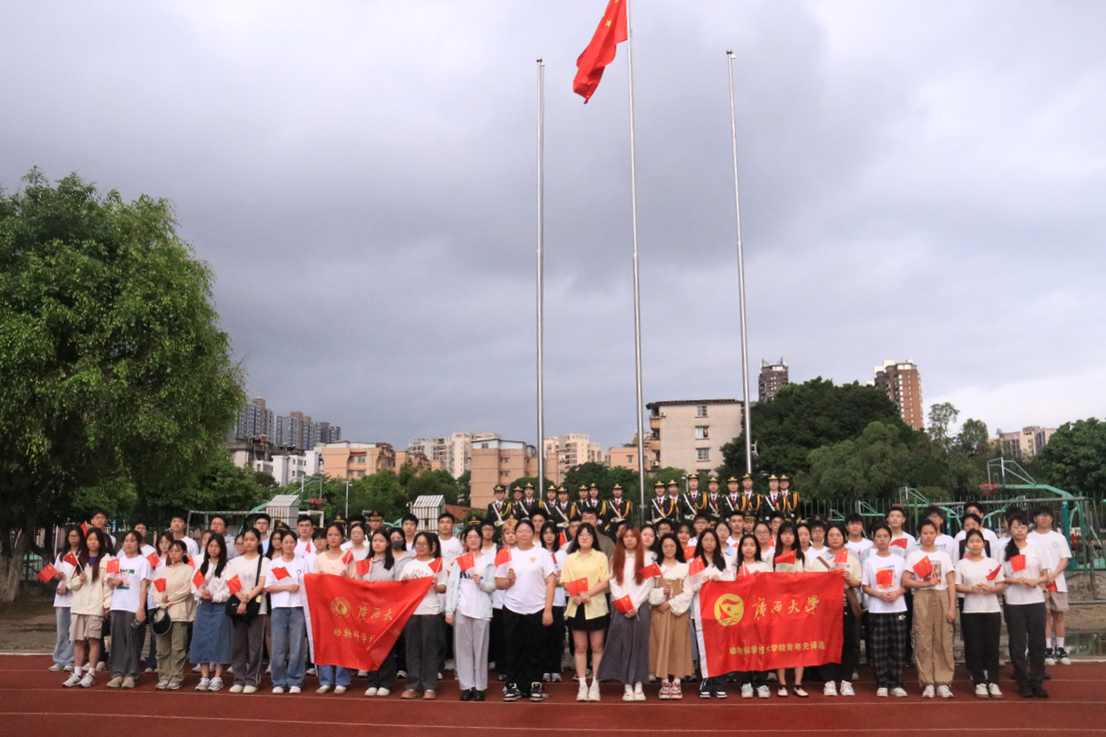在全场师生的注目下,英姿飒爽的国旗护卫队队员,迈着整齐划一、铿锵有力的步伐,护送鲜艳的五星红旗进场,伴随着雄壮的《义勇军进行曲》,五星红旗在晨光中冉冉升起,迎风飘扬。全体师生庄严肃立,齐唱国歌,向国旗行注目礼。