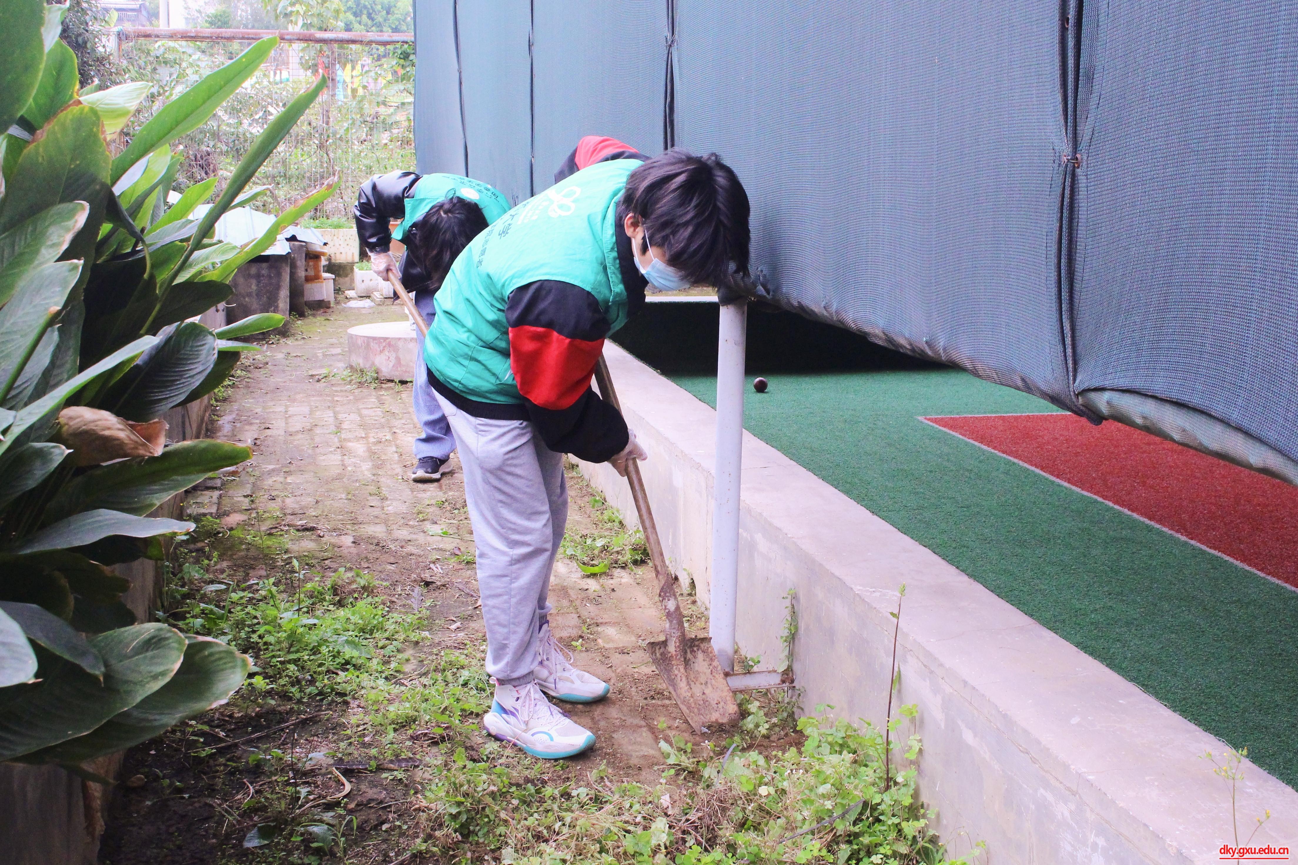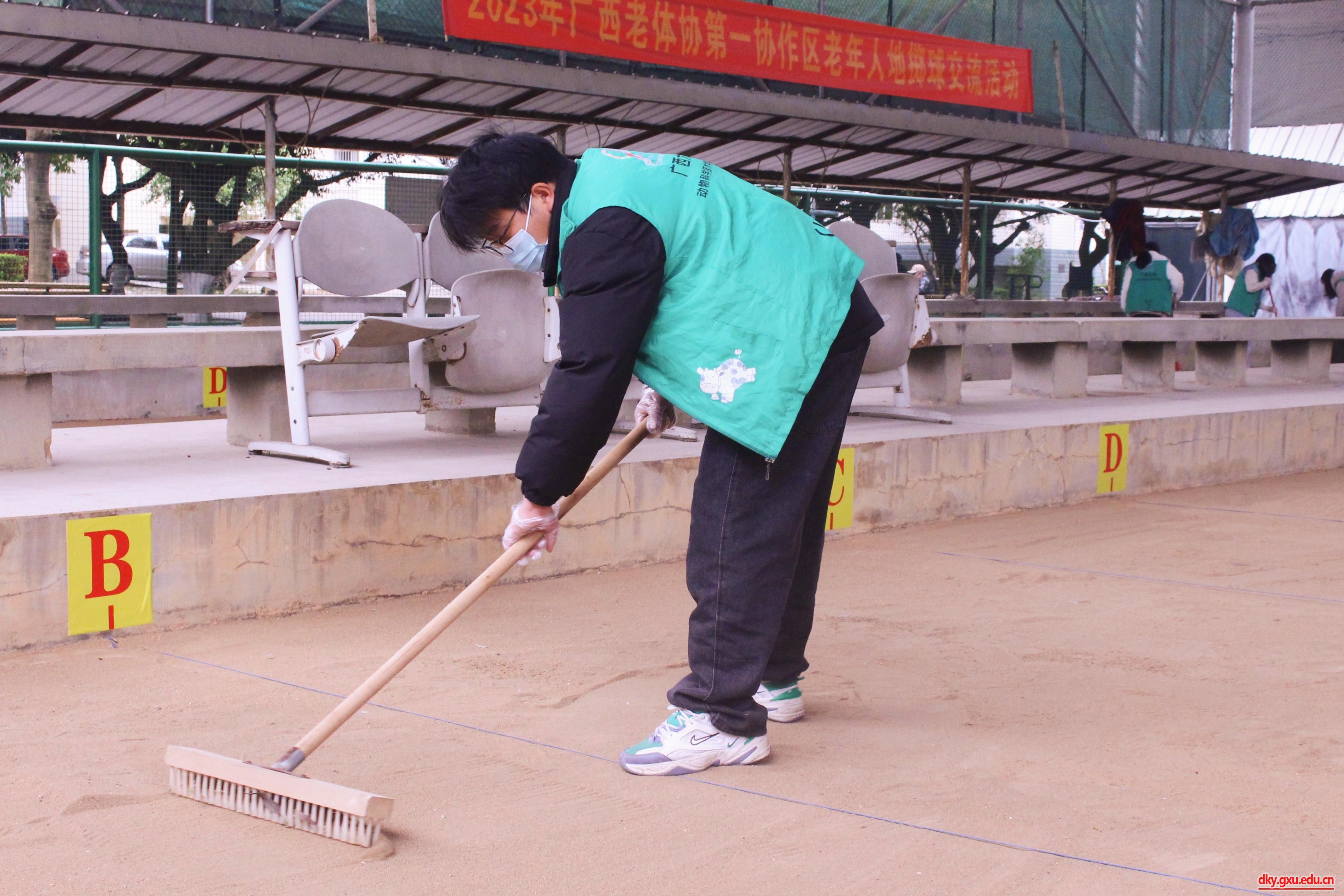 志愿者们身穿绿色马甲,拿着抹布、扫帚、铲子等工具,分工协作,相互配合,对活动中心内的垃圾、杂草等进行清理。经过两个小时的辛勤劳动,球场焕然一新。