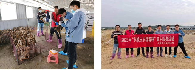 2月15日,教工二支部党员、广西肉鸽行业协会秘书长、党支部副书记韦天超副教授带领研究生与北海市动物疫病预防控制中心专家到北海市和浦县合天宝龙公司海鸭养殖基地指导鸭病防控技术指导以及采样进行流行病学调查。