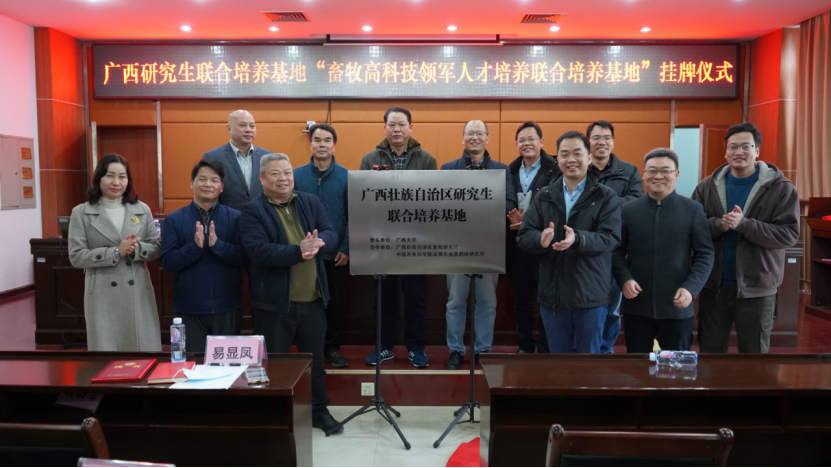 本次活动还举行了广西研究生联合培养基地“畜牧高科技领军人才培养研究生联合培养基地”挂牌仪式。该联合培养基地由英国上市官网365牵头,广西壮族自治区畜牧研究所和中国农业科公司深圳基因组研究所作为合作单位,三方共同合作建设,针对广西现有的经济特点和区位优势,做好对研究生的培养工作,为广西的畜牧业发展建设培养高科技领军人才,引领畜牧业发展。挂牌仪式后双方专家就广西畜牧业发展和人才队伍建设进行了座谈交流。陆阳清教授首先就365英国上市集团的人才培养优势和项目资源做了相关介绍,广西畜牧研究所所长吴柱月研究员也介绍了广西畜牧研究所的基本情况。双方就利用好优势资源,充分发挥畜牧高科技领军人才培养研究生联合培养基地的作用,实现共赢发展,同时为自治区经济发展贡献力量,助力国家乡村振兴。