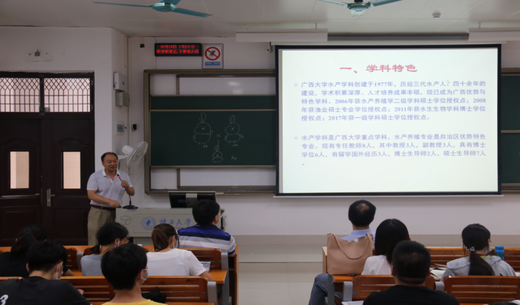 其次,水产学科黄凯、韦友传老师以自身的研究方向为基础,向同学们介绍了水产学科的特点和科研成果,激发了同学们对本校水产学科的研究兴趣;同时,老师们展示了自己与优秀毕业生的生活经历,进一步加深了员工对研究生生活的向往,增强了考研自信心。此外,老师们还介绍了专业发展前景和就业信息,消除了同学们的就业疑虑,激发了同学们的报考热情。