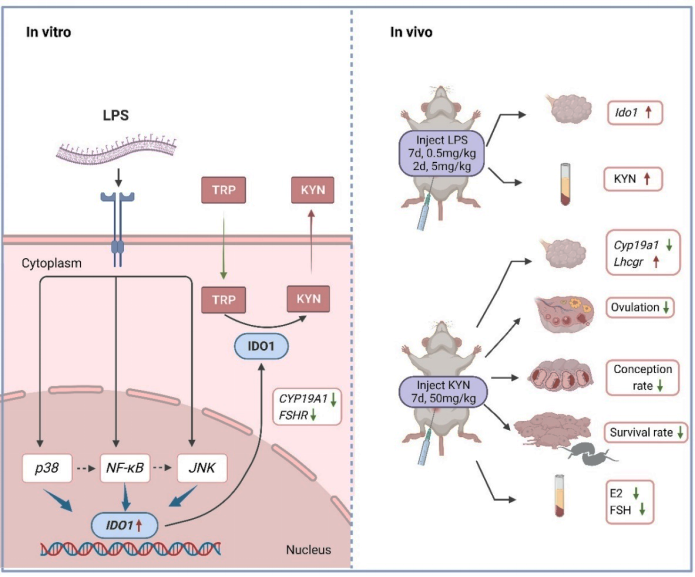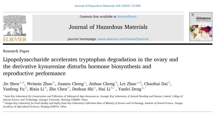 2023年7月,公司石德顺研究员团队邓彦飞副教授在国际Top期刊《Journal of Hazardous Materials》(中科院一区,Top 2%,IF=13.6)在线发表了题为“Lipopolysaccharide accelerates tryptophan degradation in the ovary and the derivative kynurenine disturbs hormone biosynthesis and reproductive performance”的研究成果,首次报道了环境中细菌内毒素(脂多糖/LPS)引发卵泡颗粒细胞色氨酸/犬尿氨酸代谢异常(犬尿氨酸堆积)影响动物卵巢功能和繁殖性能的新机制。内毒素是革兰氏阴性菌细胞壁的主要组成成分,以脂多糖(Lipopolysaccharide, LPS) 为主要代表。在细菌死亡和裂解时,LPS被释放到周围环境中。由于其化学和热稳定性较强,LPS可以在多种环境条件下长期存在。随着畜牧业养殖规模增加和养殖密度提高,因饲养管理不善常常造成动物所处的生活环境较恶劣,因而更容易受到细菌和LPS的感染。现有研究表明,动物感染LPS时,LPS可通过血液循环进入卵泡液并作用于卵泡颗粒细胞而影响其功能,如导致激素分泌失衡、卵巢功能衰竭等,最终引起繁殖性能降低,但其潜在机制尚不清楚。该研究发现,LPS作用于猪卵泡颗粒细胞时可通过p38, NF-κB和JNK信号通路增强色氨酸代谢的关键酶Ido1的表达,从而引起色氨酸代谢加速,造成其衍生物犬尿氨酸堆积,进而抑制Cyp19a1和Fshr的表达,减少雌激素合成,最终影响猪卵泡颗粒细胞的功能。进一步的小鼠模型研究结果也表明,LPS诱导小鼠卵巢中Ido1高表达,并引发血液中犬尿氨酸水平升高。通过直接给小鼠腹腔注射犬尿氨酸可发现激素分泌失衡,并显著抑制了排卵和黄体形成,最终降低了繁殖性能(受胎率和活仔率降低)。该研究阐明了LPS感染通过诱导色氨酸代谢紊乱影响动物卵巢功能和繁殖性能的机制,首次发现色氨酸-犬尿氨酸代谢紊乱(犬尿氨酸堆积)破坏卵巢功能、降低动物繁殖性能。该研究为提高家畜繁殖效率乃至治疗人类卵巢功能障碍引起的不孕提供了新的见解。