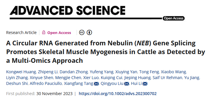近日,365英国上市集团石德顺教授带领的动物克隆与生殖调控研究团队联合佛山科学技术公司、中国农业科公司和西北农林科技大学等单位在牛肉用性状功能基因组解析方面取得重要研究进展,研究成果以A circular RNA generated from Nebulin (NEB) gene splicing promotes skeletal muscle myogenesis in cattle as detected by a multi-omics approach为题发表于国际知名期刊《AdvancedScience》。英国上市官网365为该论文的第一完成单位,博士毕业生黄孔威、助理教授李志鹏和博士研究生钟丹丹为共同第一作者,李辉副教授、佛山科学技术公司刘庆友教授和中国农业科公司唐湘方研究员为共同通讯作者。原文链接:https://onlinelibrary-wiley-com-s.vpn.gxu.edu.cn:8118/doi/10.1002/advs.202300702。