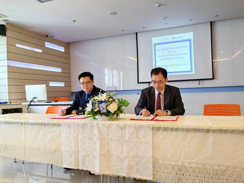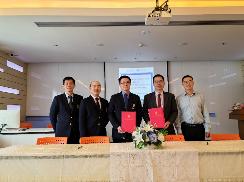 陆阳清经理与朱拉隆功大学兽医公司学术、国际和员工事务副经理、朱拉隆功大学兽医公司亚热带农业生物资源保护与利用国家重点实验室首席研究员Sonthaya Tiawsirisup博士共同签署合作框架协议,双方教职工代表在合作备忘录签署仪式合影留念。